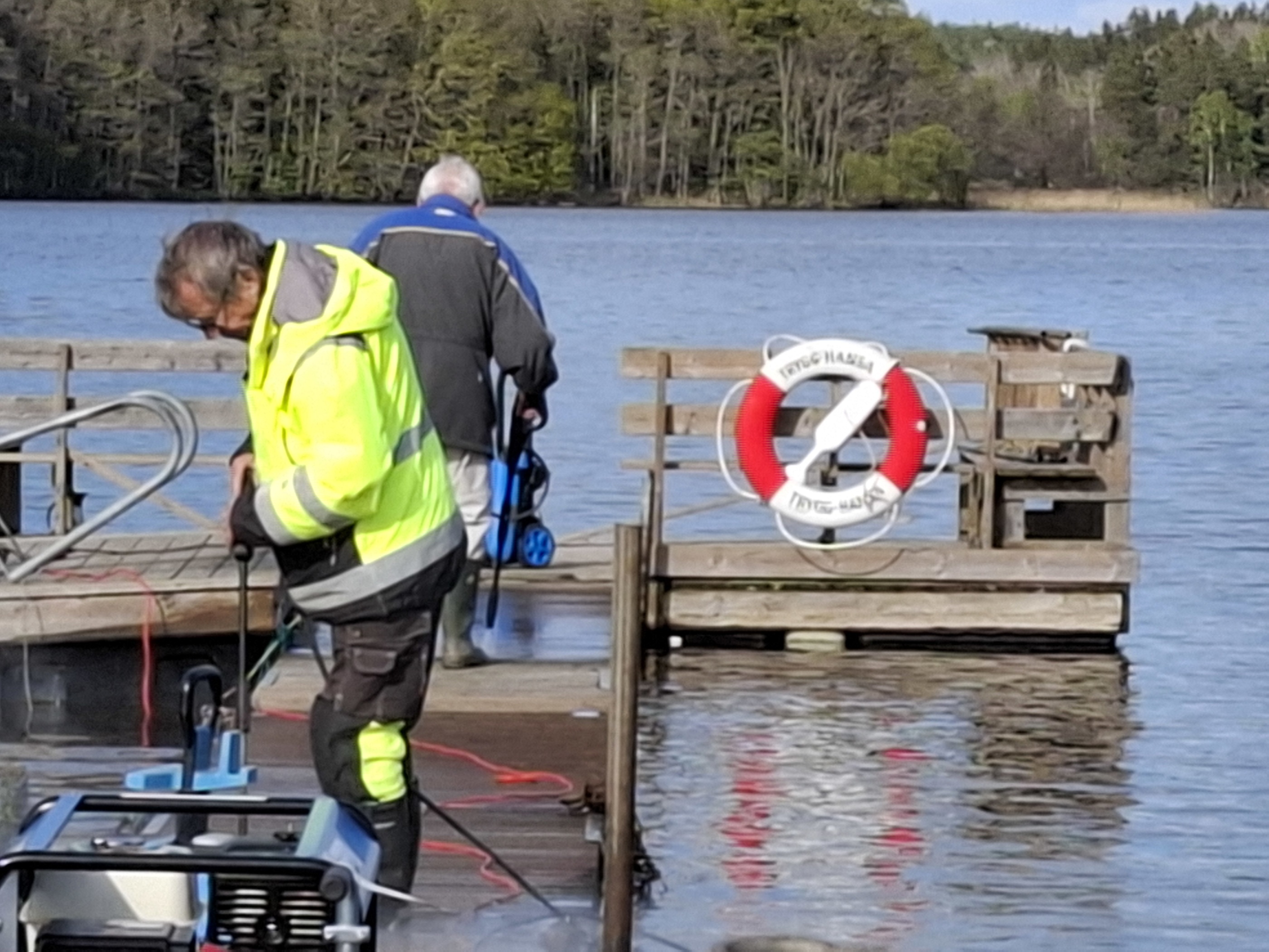 Det behövs ett elverk, två högtryckstvättar, två dagar och två flitiga män – Janne och Juha – för att bryggan ska bli ren. Bryggan ska också oljas under sommaren.